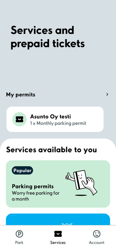 Your parking permit's details can be found in Aimo app's "Services" tab beneath the "My permits" header. You'll be able to edit your permit's settingsby clicking on the permit.