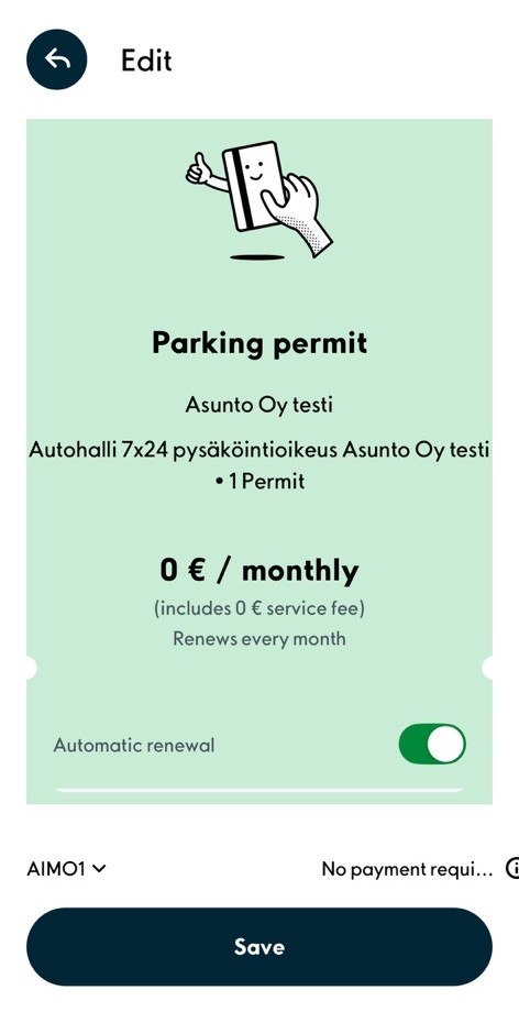 Please note to add a payment card on your permit, should you switch your payment card in Aimo app's "Account" window.