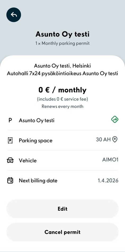 The "Edit" button enables you to switch the permit's license plate number and and edit the automatic renewal's settings. When the automatic renewal's tab is green, the renewal has been enabled and the permit renews itself automatically. Should the automatic renewal be disabled, the parking permit will expire at the end of its current period of validity. The parking permit cannot be terminated in the middle of billing period.