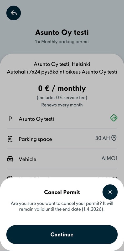 The parking permit will expire at the end of its current period of validity. You can continue parking with your permit until the last day of validity. The permit cannot be terminated in the middle of billing period.