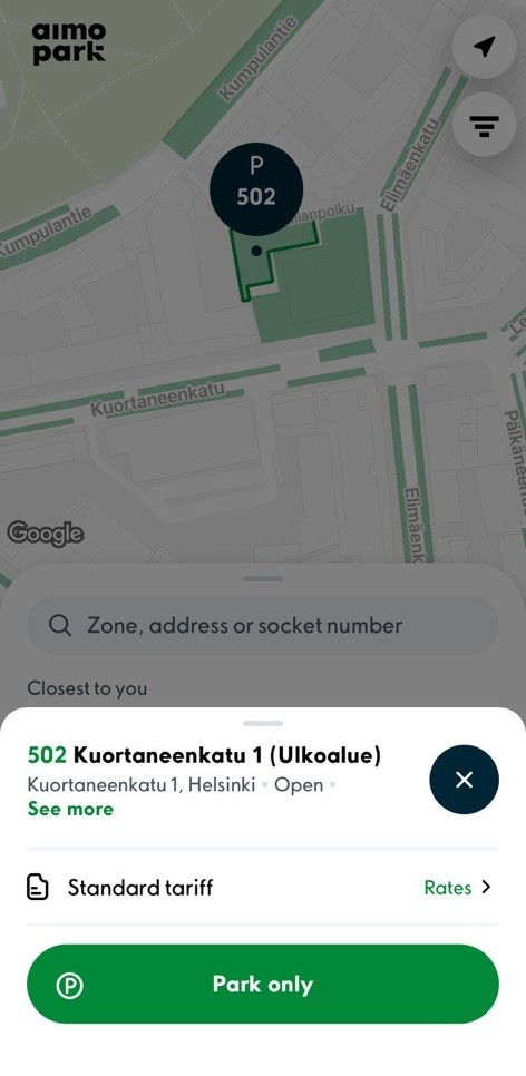 1. Start by finding the right parking location in the Park-window of the application by moving the map. You can also search the parking location by name or address.