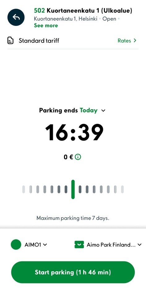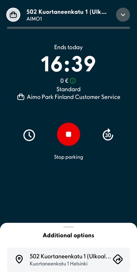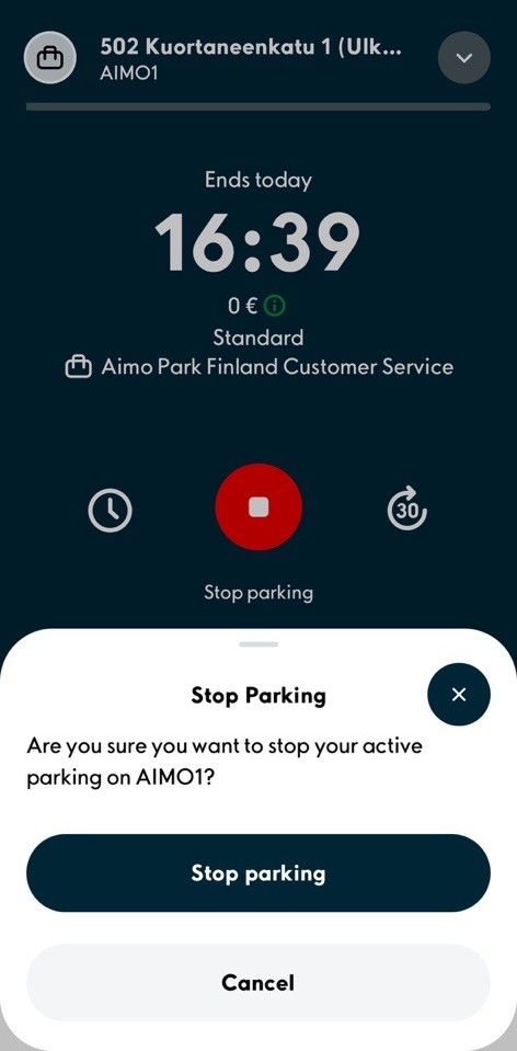 3. It is possible to extend the duration of parking during parking by clicking on the clock icons in the parking information. It is also possible to end parking before the end time you have set by pressing the red end button.