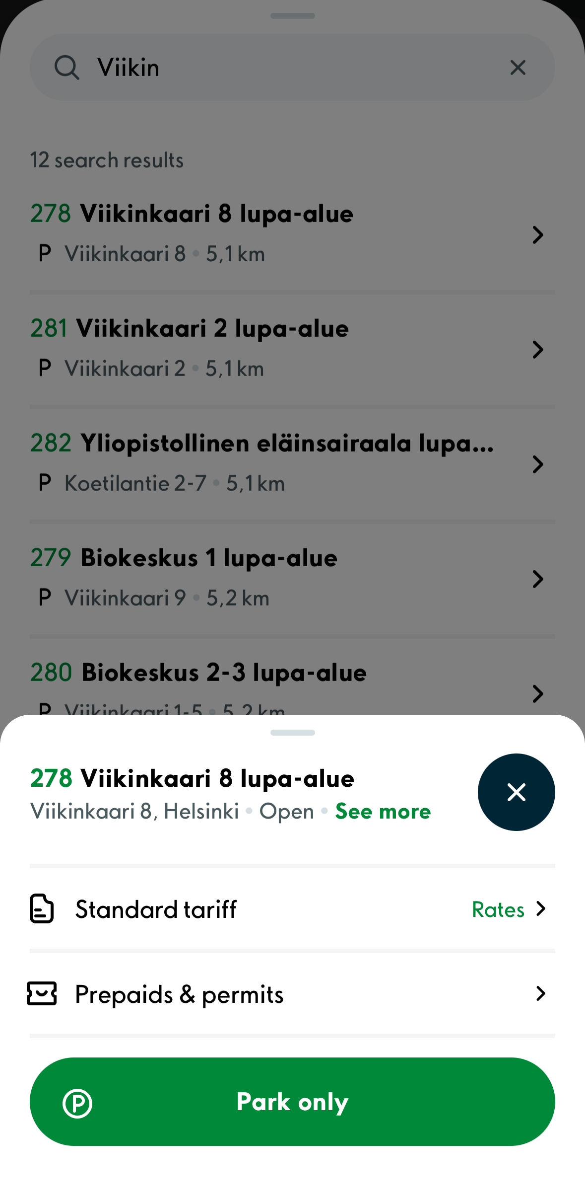 1. Search for any of Viikki campus parking zones in the ”Parking” window.