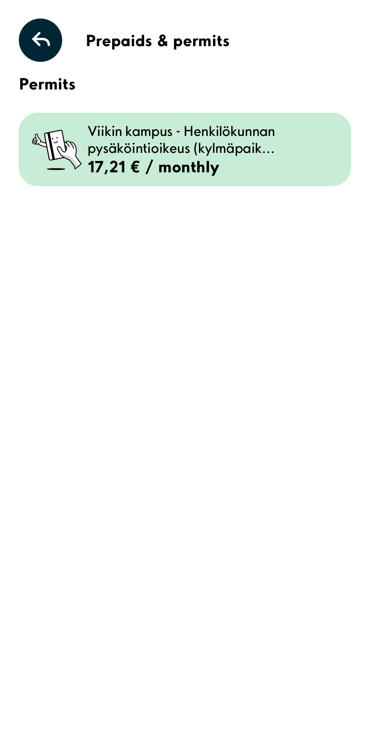3. In the window that opens up, select the permit "Viikin kampus - Henkilökunnan pysäköintioikeus (kylmäpaikat)" for purchasing.