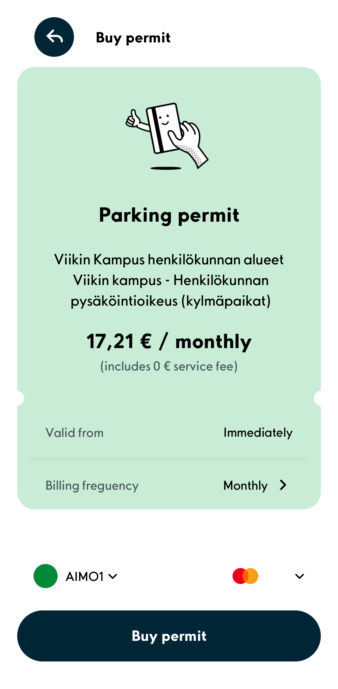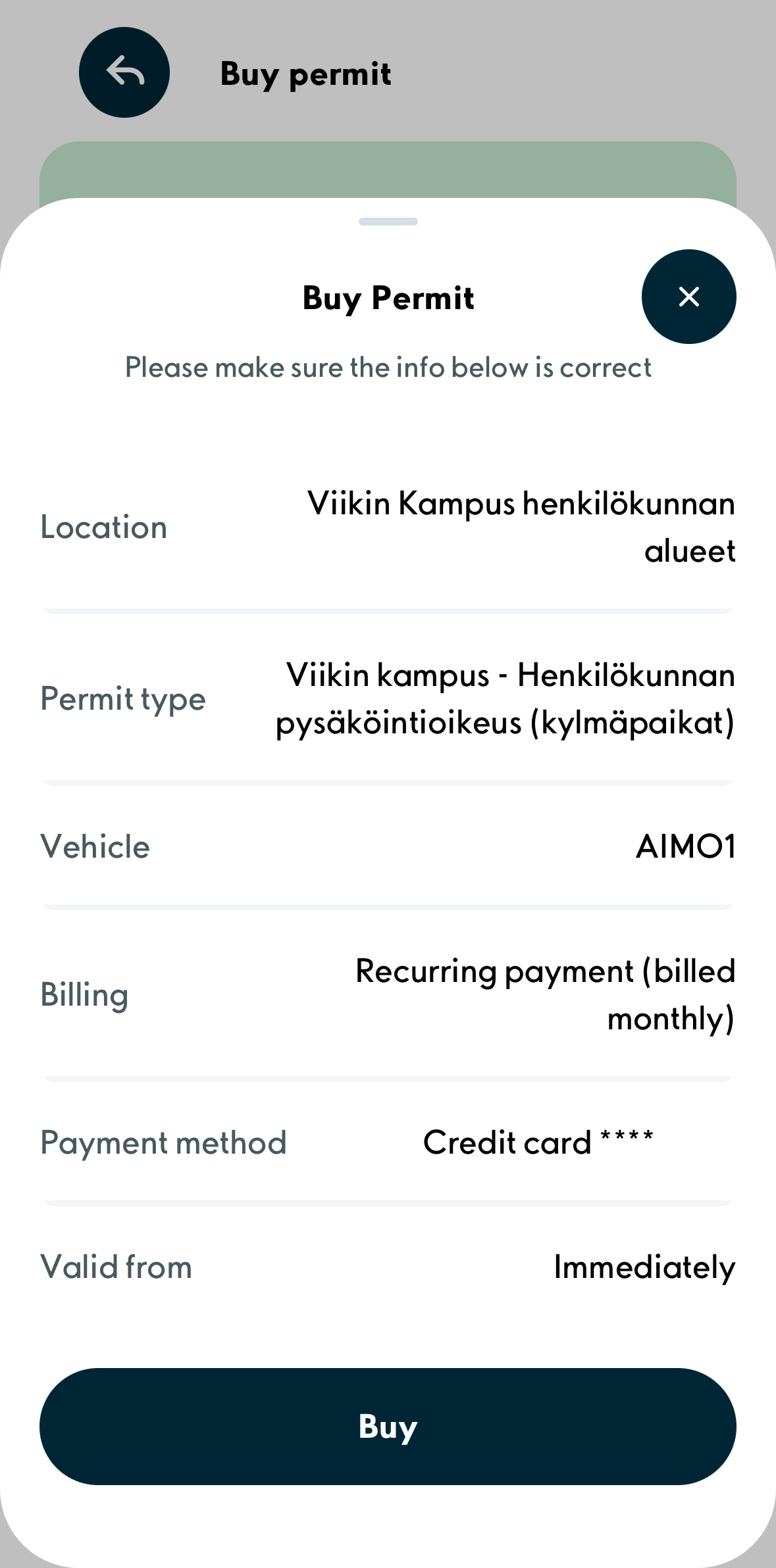 5. Check the parking permit’s information and confirm your purchase by clicking the ”Buy” button.
