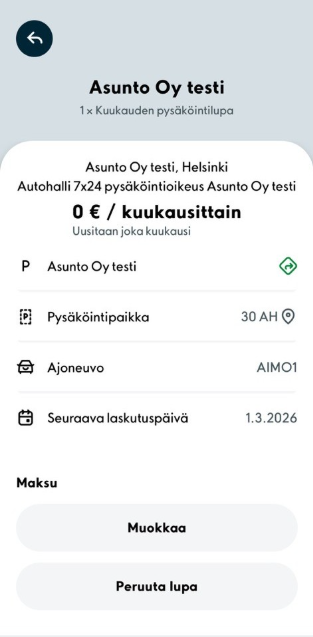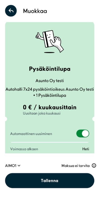Muokkaa–painikkeesta voit muokata pysäköintiluvan rekisteritunnusta tai muokata automaattisen uusiutumisen asetuksia. Kun automaattisen uusiutumisen kohta on vihreä, luvalle on sallittu automaattinen uusiutuminen ja lupa uusiutuu automaattisesti. Kun asetat automaattisen uusiutumisen pois päältä, pysäköintilupa umpeutuu sen hetkisen laskutuskauden loppuun. Pysäköintilupaa ei voi irtisanoa kesken laskutuskauden.