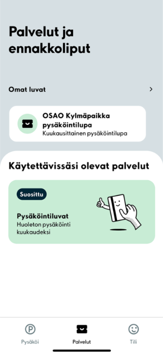 Aimo -sovelluksessa pysäköintiluvan tiedot löytyvät Palvelut-ikkunasta Omat luvat-kohdasta. Klikkaamalla pysäköintilupaa voit tehdä halutessasi muutoksia pysäköintiluvan asetuksiin.