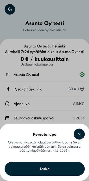 Pysäköintiluvan automaattisen uusiutumisen voi päättää kahdella tavalla. Muokkaa-painikkeesta tai painamalla Peruuta lupa-painiketta.