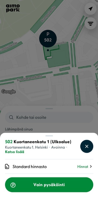 Pysäköintikohteen hinnaston voit tarkistaa Hinnat-painikkeesta.