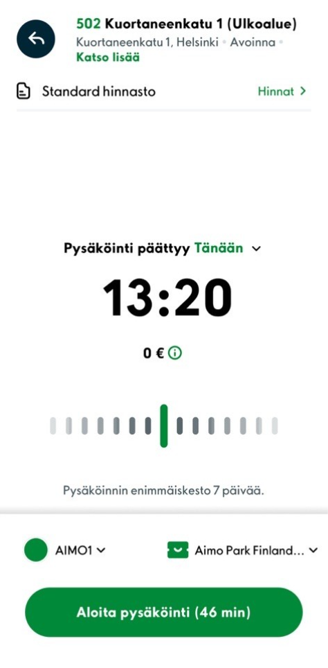 2. Kun olet valinnut haluamasi kohteen, aseta seuraavaksi arvioimasi pysäköintiaika, ajoneuvosi rekisterinumero, haluamasi maksukortti ja aloita pysäköinti painamalla Aloita pysäköinti-painiketta.