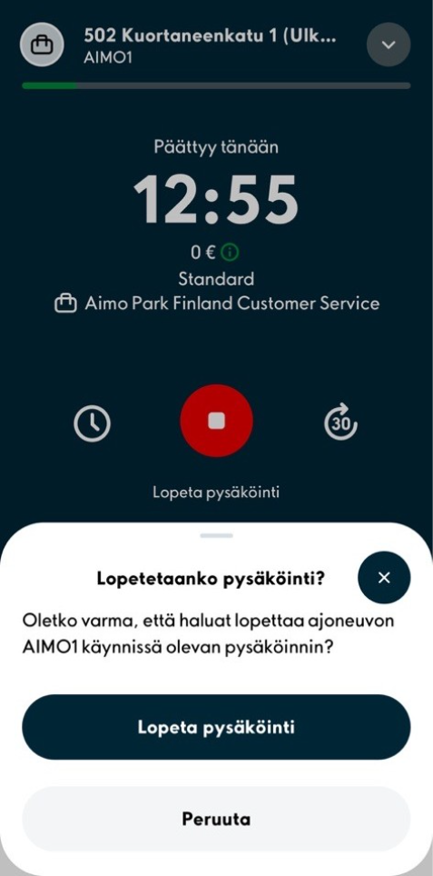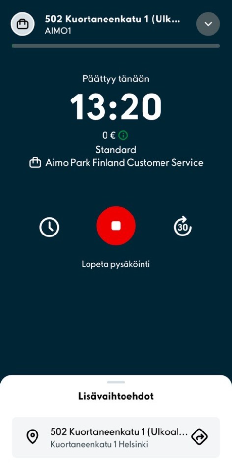 3. Pysäköinnin kestoa on mahdollista jatkaa pysäköinnin aikana painamalla pysäköinnin tiedoista kellon kuvakkeita. Pysäköinti on mahdollista myös päättää ennen asettamaasi päättymisaikaa painamalla punaista päättymis-painiketta. Muutoin pysäköinti päättyy asetettuun päättymisaikaan.