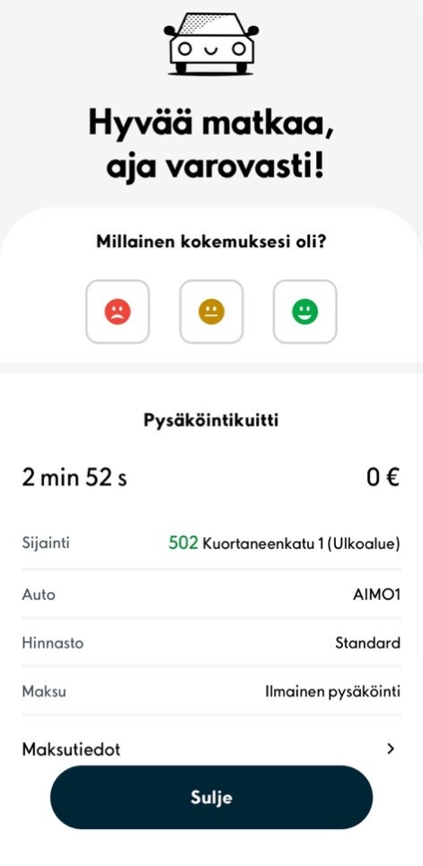 4. Pysäköinnin päättyessä näet pysäköintitapahtuman yhteenvedon.