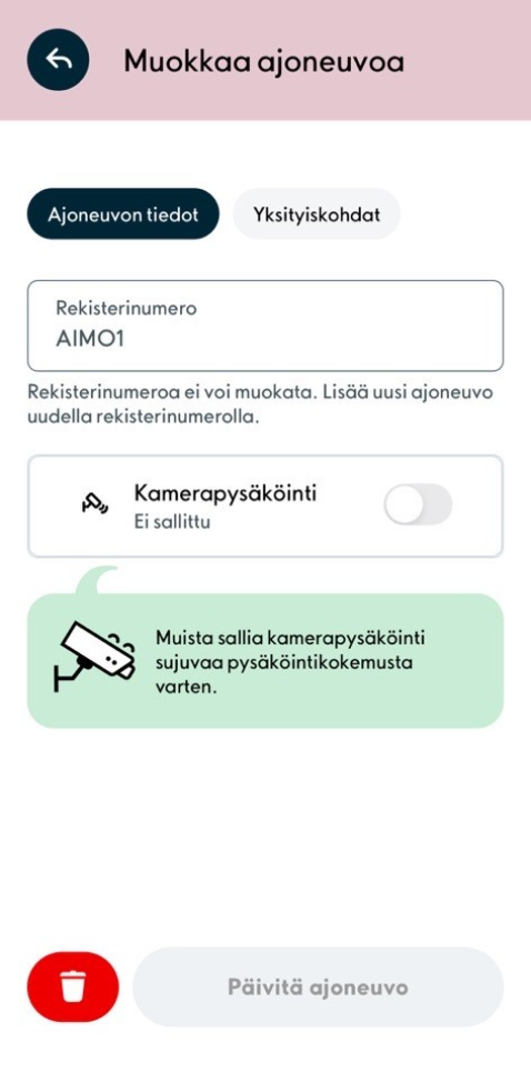 3. Syötä ajoneuvosi rekisterinumero sille varattuun kenttään. Yksityiskohdat-välilehdeltä voit myös lisätä ajoneuvollesi lempinimen sekä valita autolle värin ja kuvakkeen. Valitse lisäksi, haluatko käyttää ajoneuvollesi kamerapysäköintiä. Kun olet tehnyt valinnat, valitse Lisää ajoneuvo.