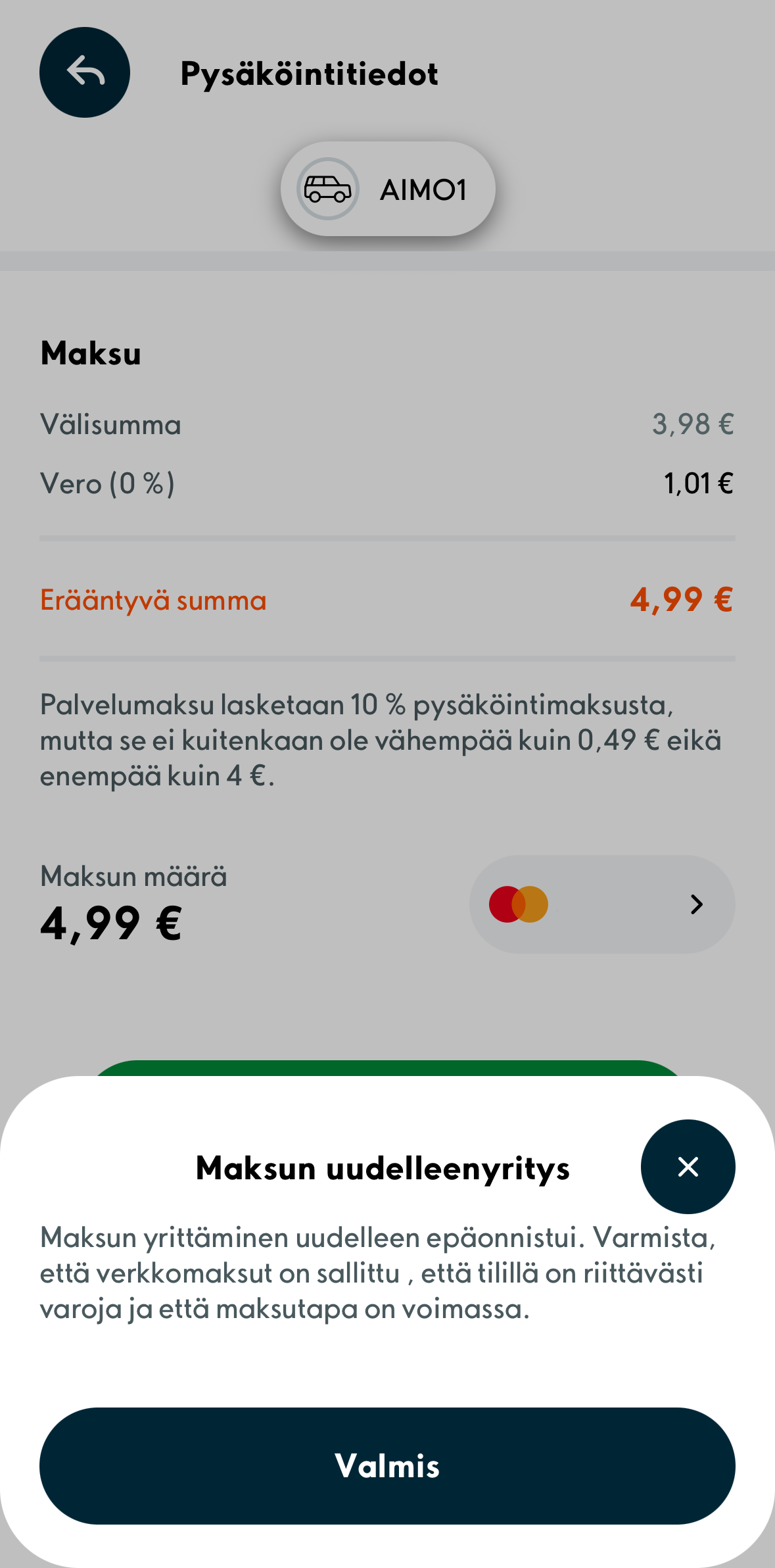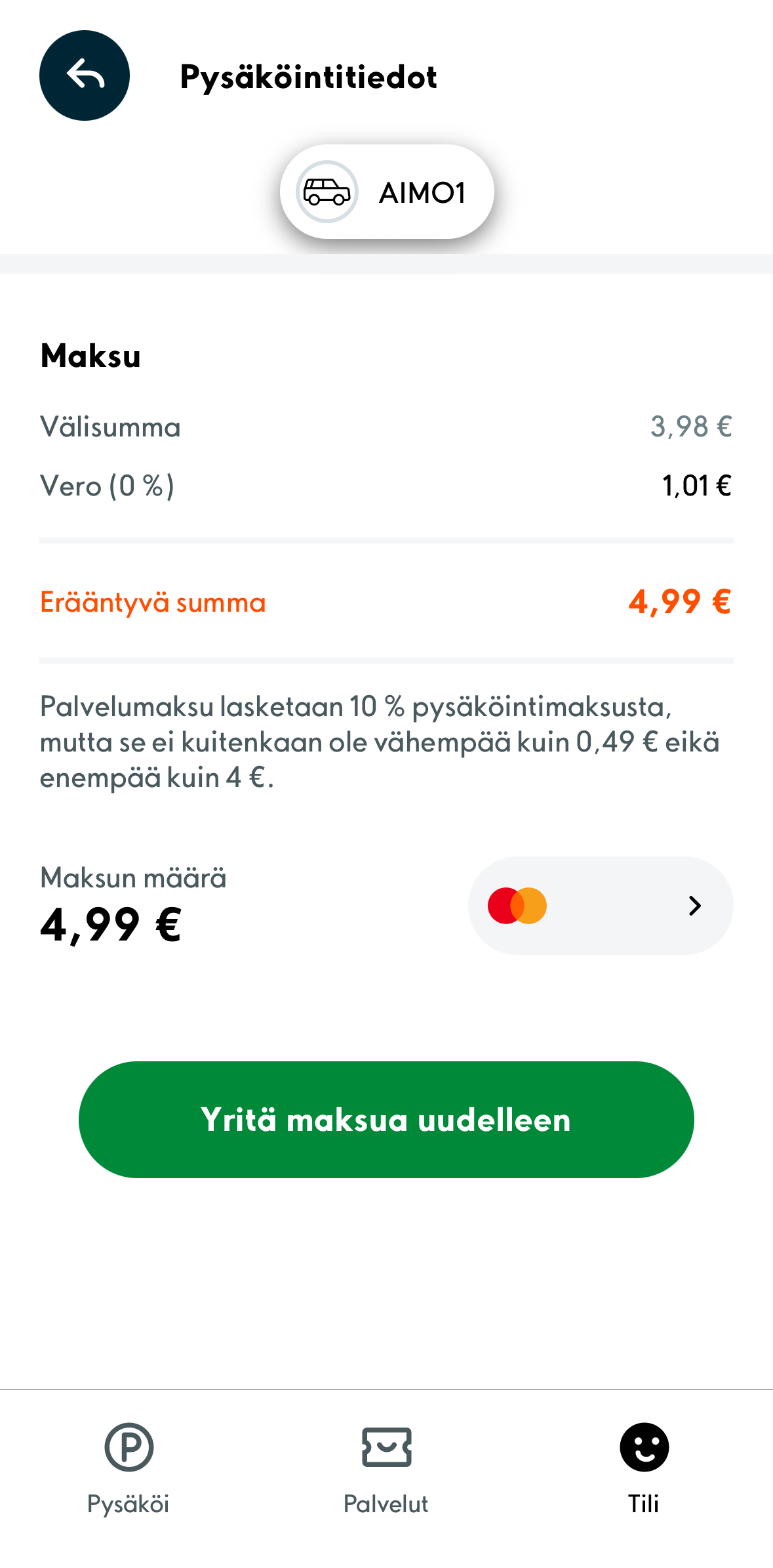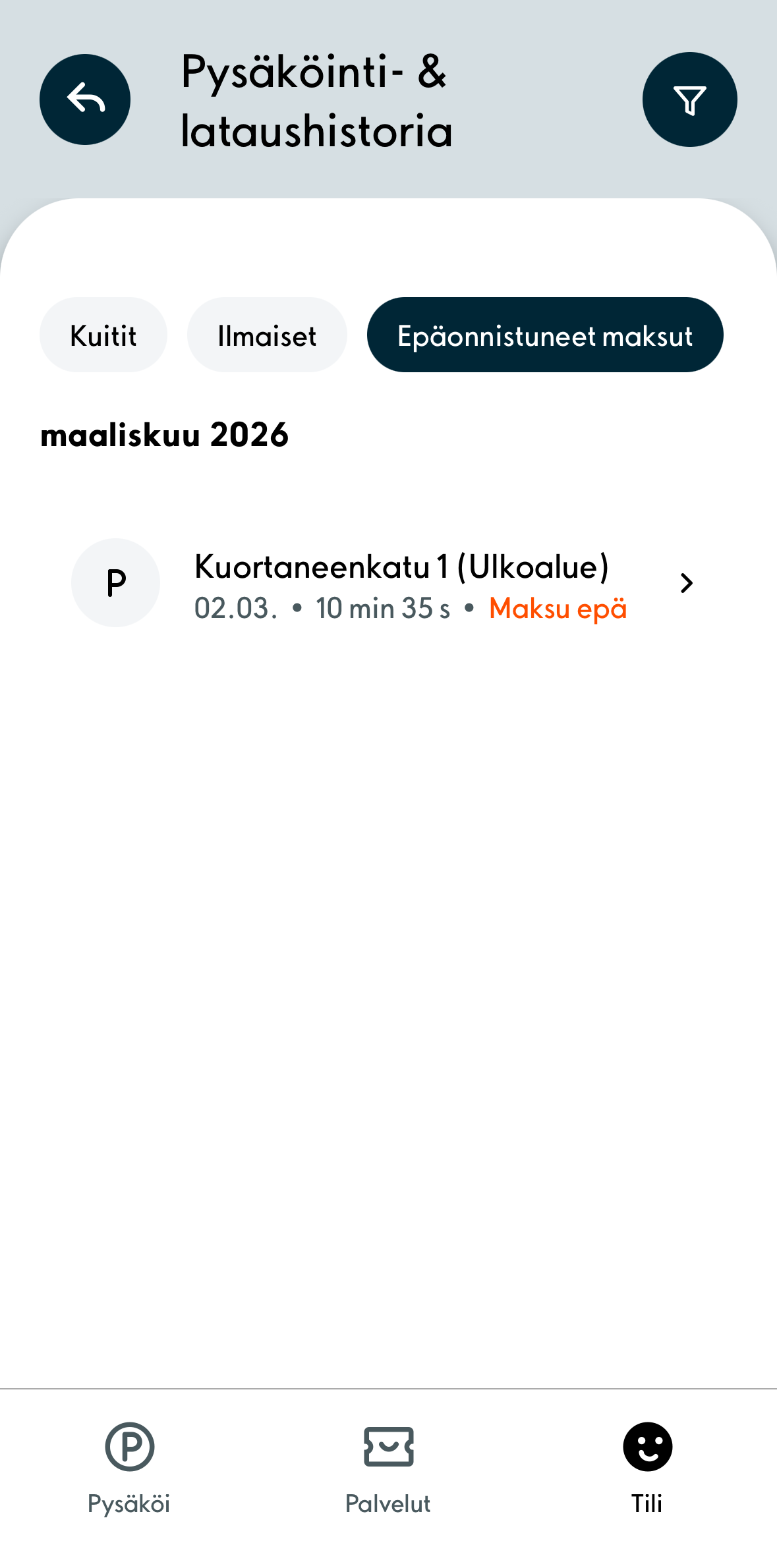 1. Löydät epäonnistuneet veloitukset Tili > Pysäköinti & Lataaminen > Epäonnistuneet maksut